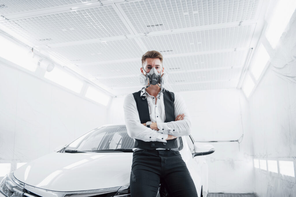Image Concept: A high-quality image of a car being painted in a professional spray booth.